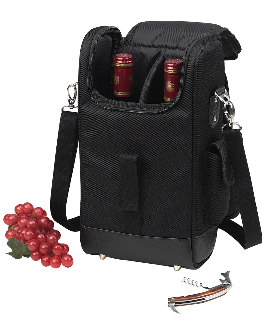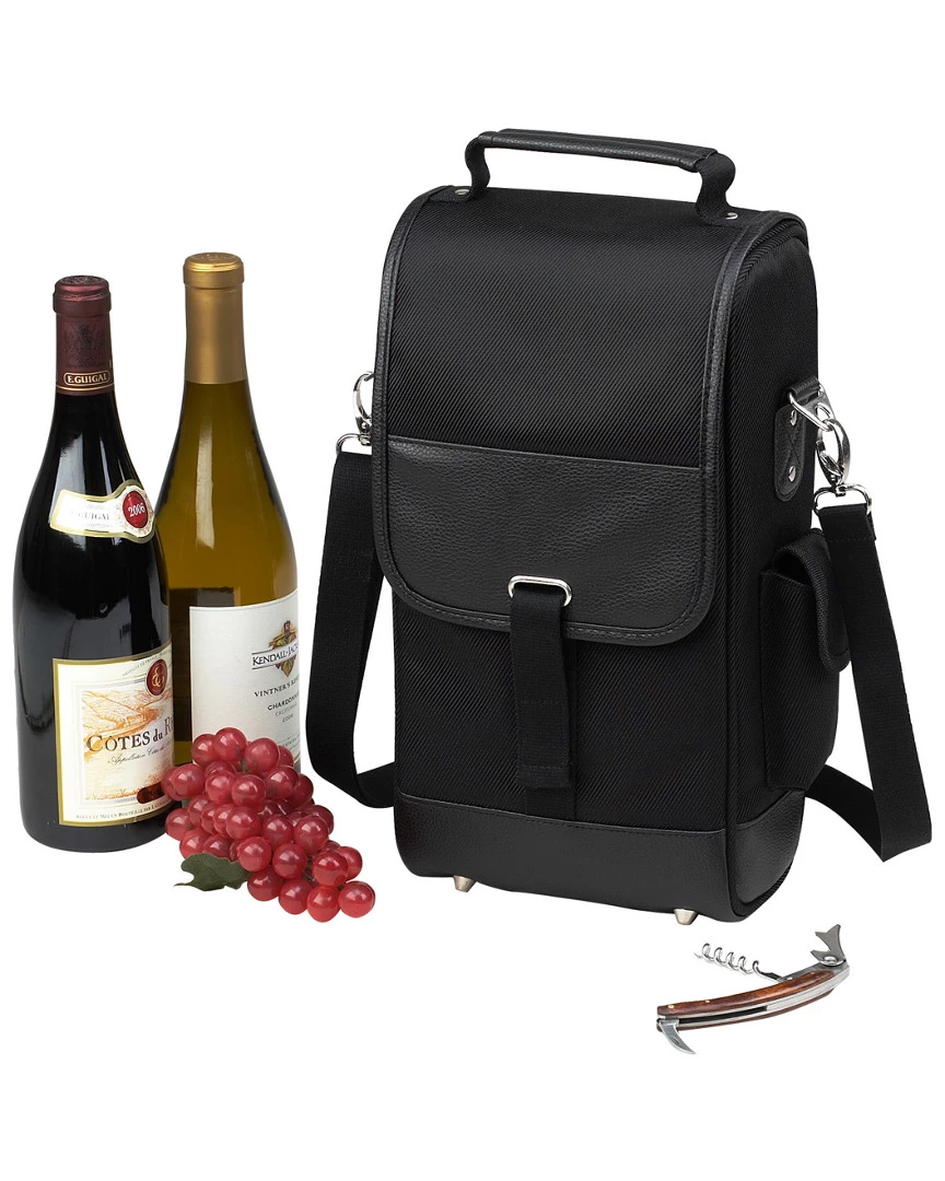 - Upscale Thermal Shieldβ’ insulated two bottle carrier with wood/stainless combination corkscrew