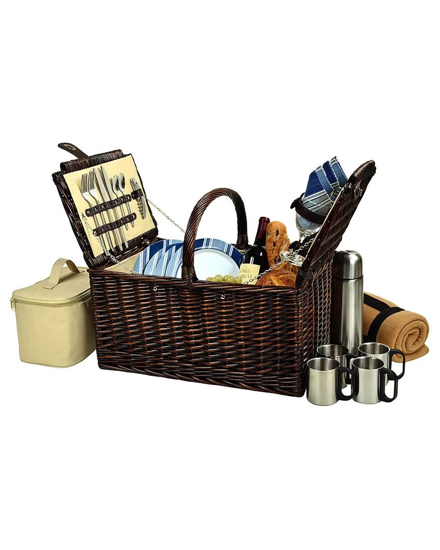 - Handcrafted blue stripe and brown wicker coffee service picnic basket set for four with blanket