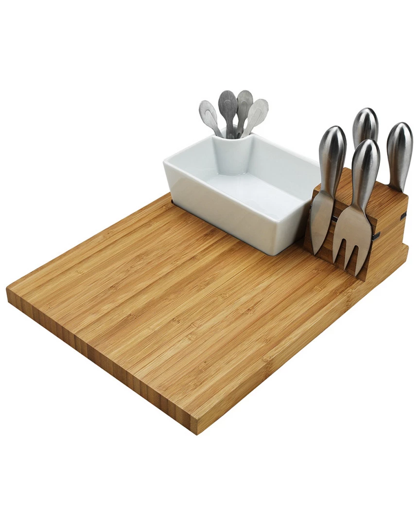 - Cheese board set includes a removable ceramic dish and stainless steel serving tools