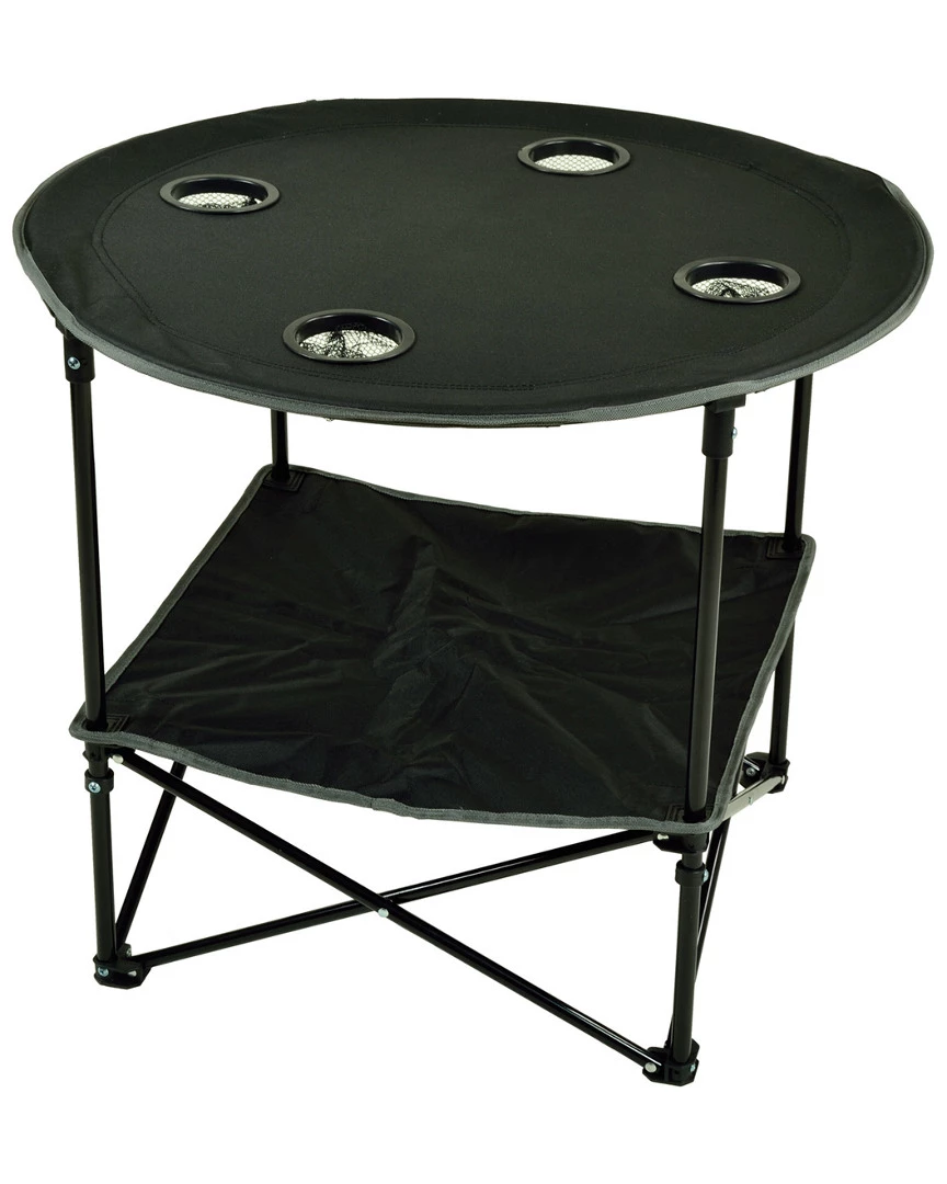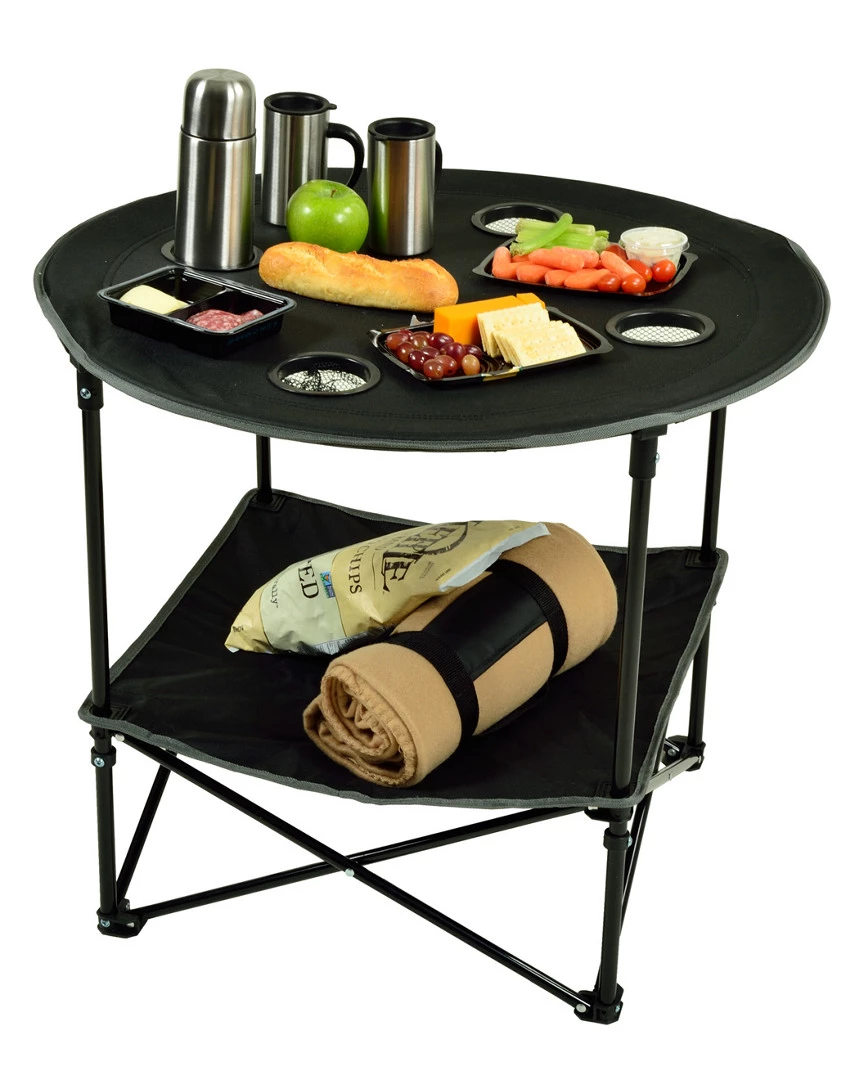 - Lightweight portable picnic table that assembles in seconds. Incorporates four mesh drink holders and lower shelf for light storage. Includes separate carry case. Folded size is 28″ x 14″ x 4.5″ . Great for the beach or park.