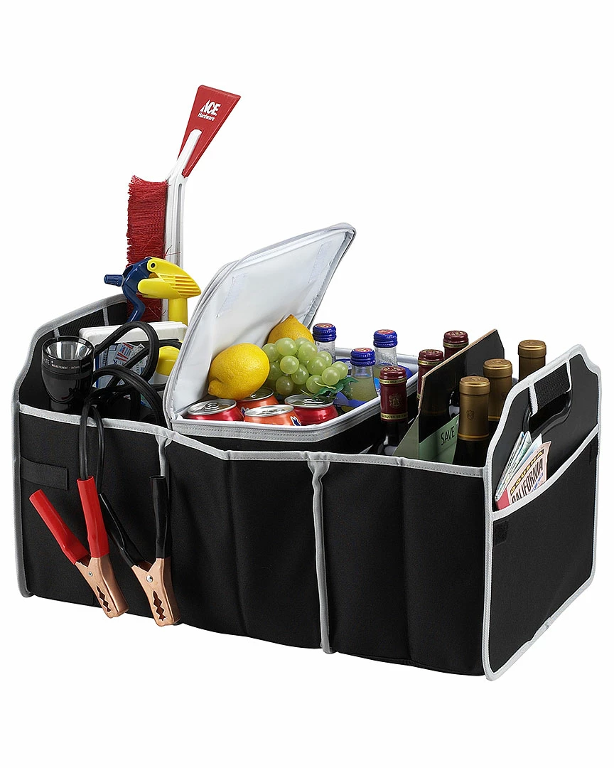 - Durable 3 section trunk organizer with cooler. Great for keeping sports gear, tailgating, camping, or groceries organized (use it in your shopping cart instead of bags). We designed our organizer with rigid support in all sides and between each section to prevent sagging and add durability. The padded and reinforced handles on each side make it easy to carry heavy loads. It also includes a convenient sleeve pocket at each end. The base is padded for extra durability. The removable cooler is insulated with high density foam and has a heat sealed leak proof lining, zips fully closed, and has a durable handle. It fits into all sections of the organizer. Both organizer and cooler fold flat for storage, secured by hook and loop. This set is durable, constructed of re-enforced 600D polycanvas fabric and is able to handle heavy loads easily. The Picnic at Ascot brand tag is sewn into each organizer/cooler set and will verify that it is covered by our Lifetime Warranty.