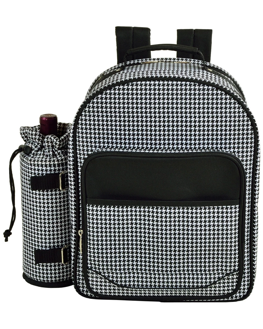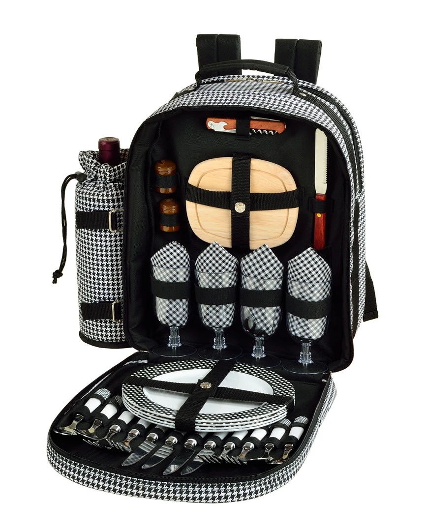 - Design details: Fully equipped picnic Backpack for four with detachable wine holder & Thermal Shield insulated cooler section, to keep food and drink at the perfect temperature. Includes combination corkscrew, hardwood cutting board, cheese knife, wooden salt & pepper shakers with non spill tops, acrylic wine glasses, 9″ melamine plates, stainless steel flatware, and napkins. From our Houndstooth Collection. Constructed of 600D polycanvas. Designed and assembled in the USA. Lifetime warranty.