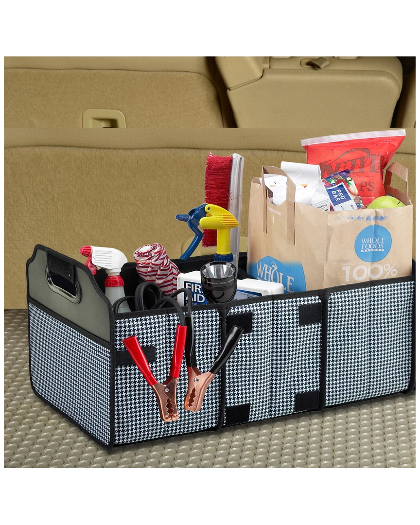 - Durable 3 section trunk organizer. Great for keeping sports gear, cleaning supplies and groceries organized. Two large outer sleeve pockets. Foldable when not in use to maintain trunk space.