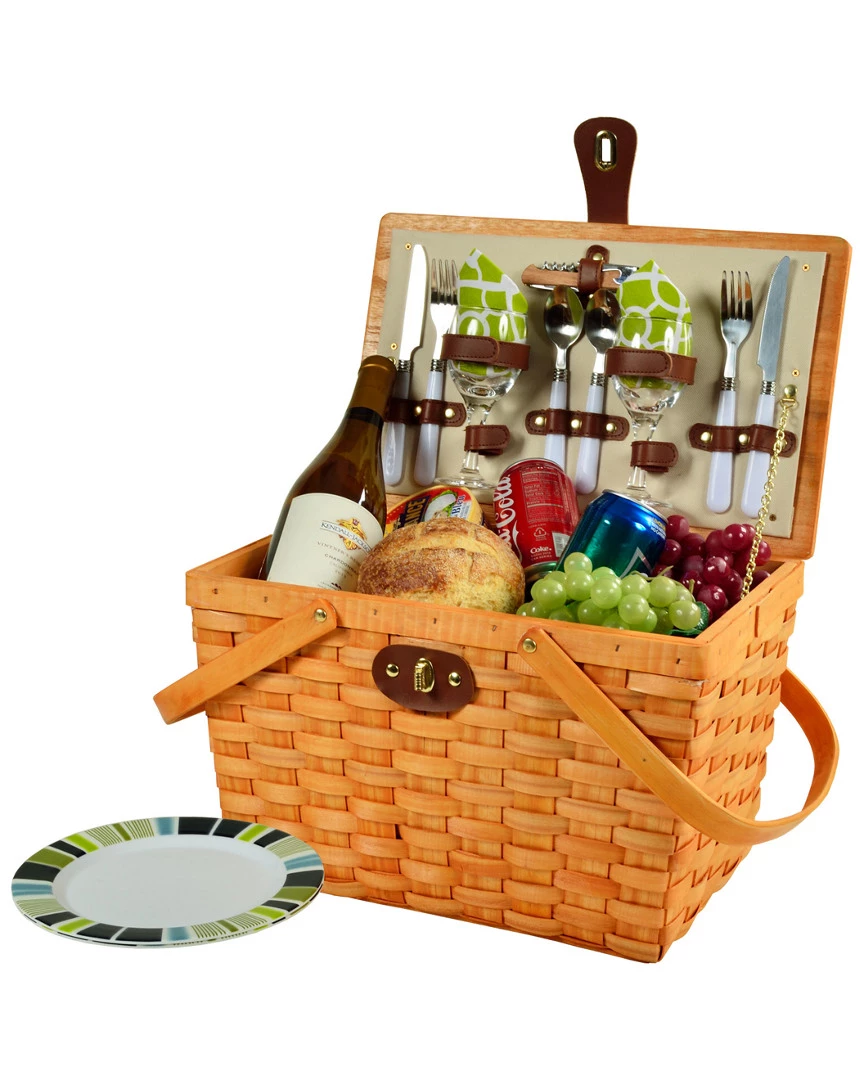 - Design details: fully lined & hand woven with traditional wood slat material, swivel wood handles and faux leather straps and closure. Set includes coordinating melamine plates and cotton napkins, glass wine glasses, stainless steel flatware, and a wood handle corkscrew.