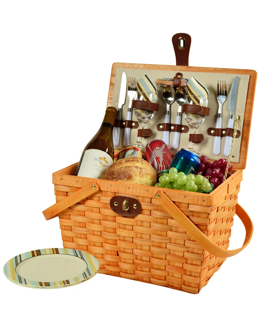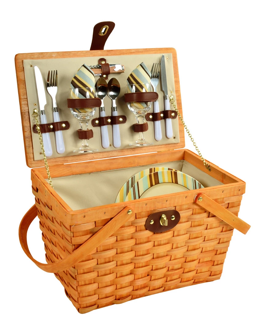- Design details: fully lined & hand woven with traditional wood slat material, swivel wood handles and faux leather straps and closure. Set includes coordinating melamine plates and cotton napkins, glass wine glasses, stainless steel flatware, and a wood handle corkscrew.
