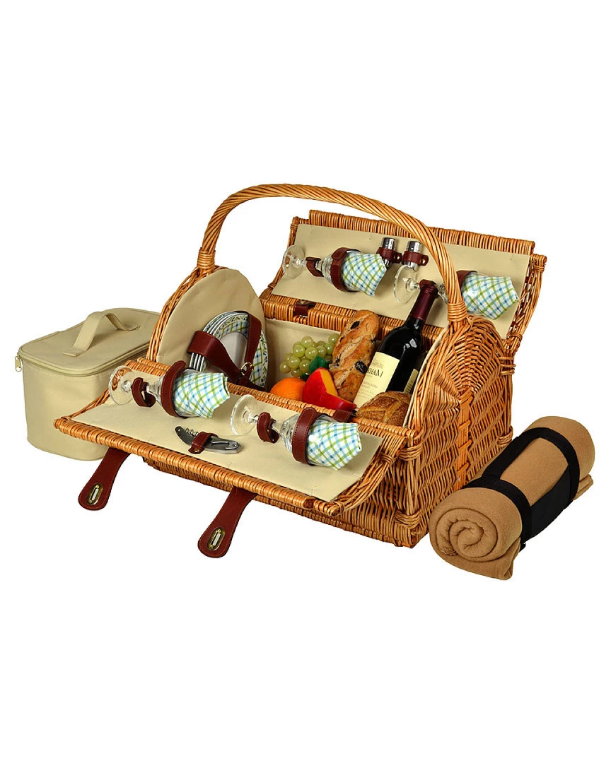 - English-style handcrafted full reed willow picnic basket for four with Gazebo dinnerware and flatware for four and fleece blanket