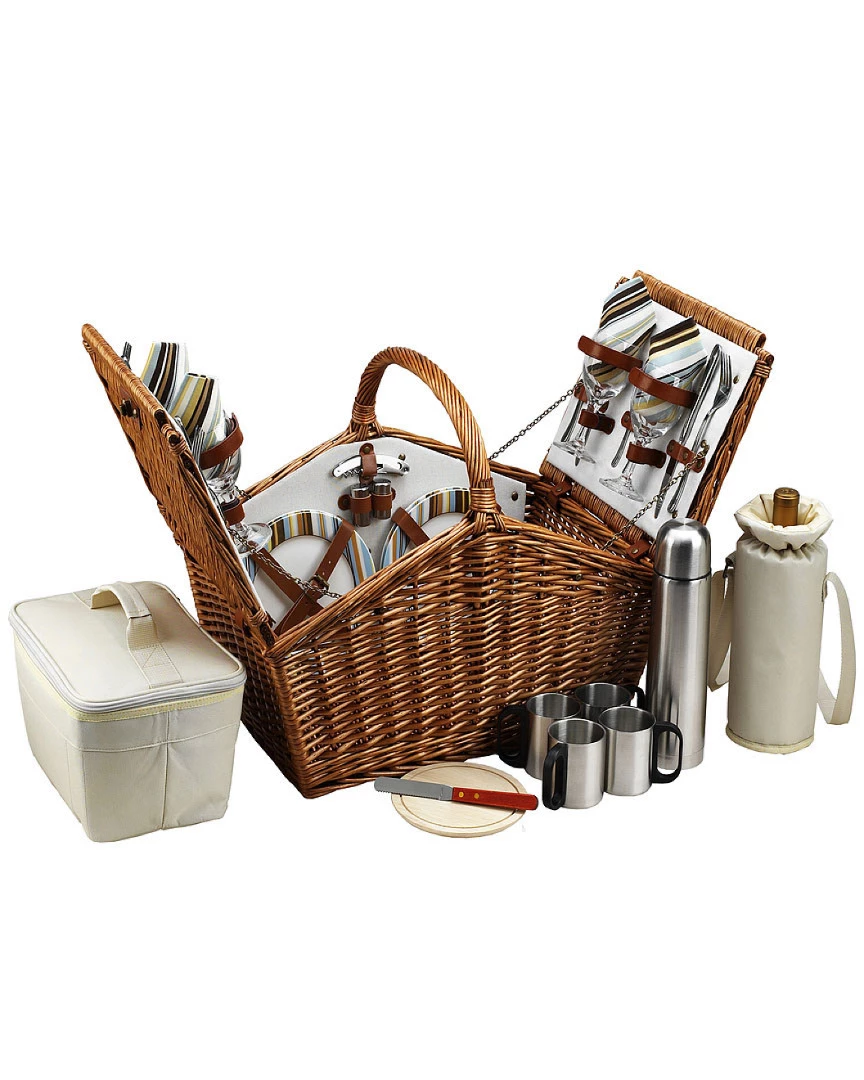 - Traditional full reed willow handcrafted picnic basket for four with traditional picnic basket shape and leather handle, closures, and hinge covers