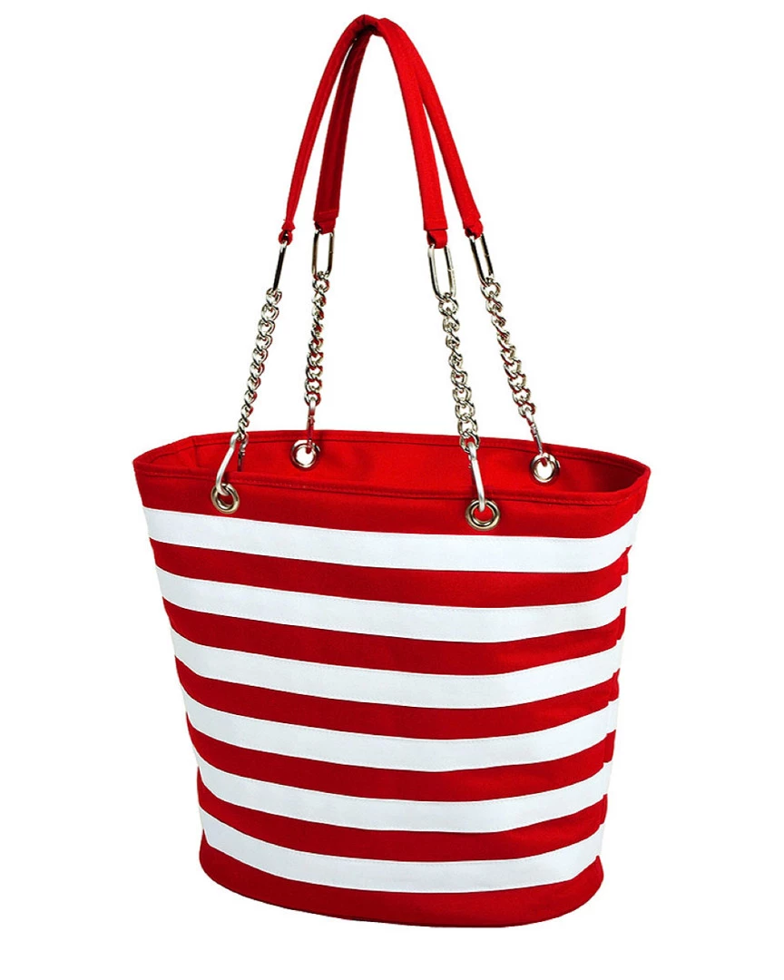 - Red and white stripe high quality insulated cooler tote with waterproof lining and distinctive silver-tone clip-on handles