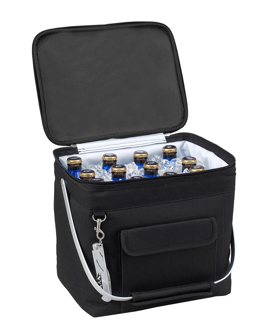 - Multipurpose beverage cooler with aluminum frame and clip-on corkscrew