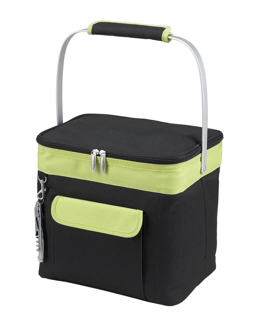 - Multipurpose beverage cooler with aluminum frame and clip-on corkscrew