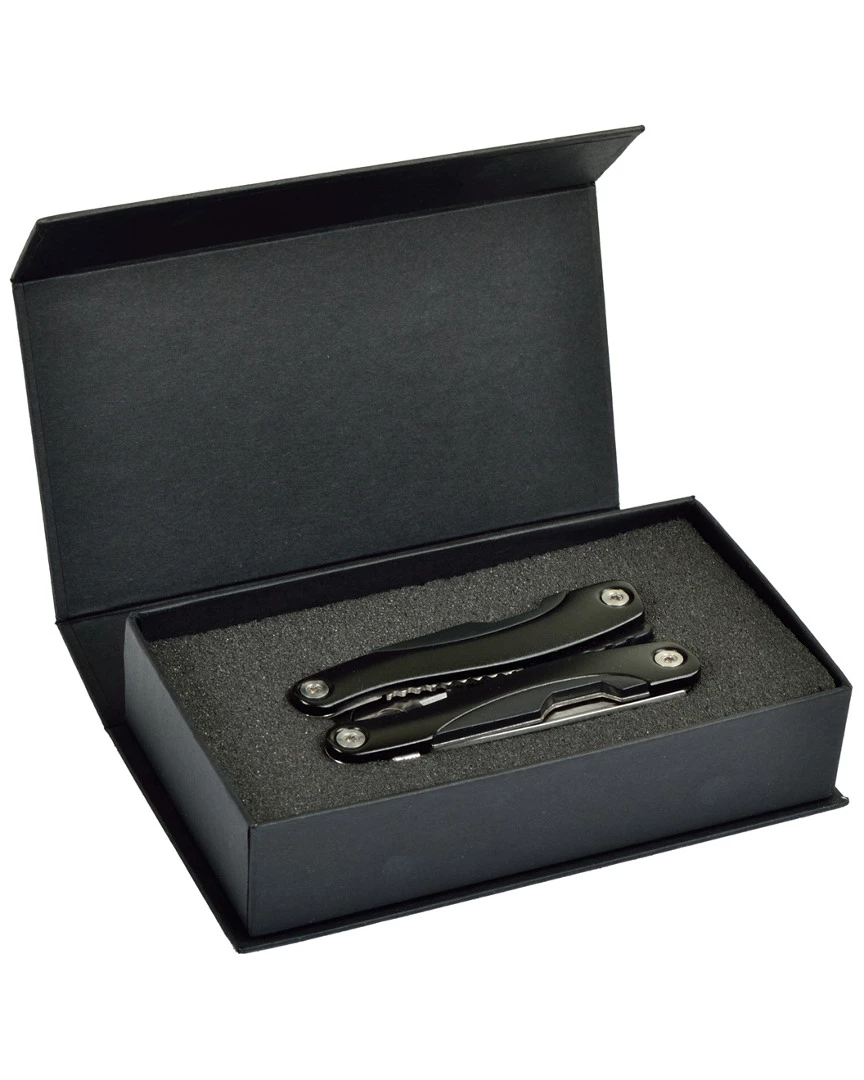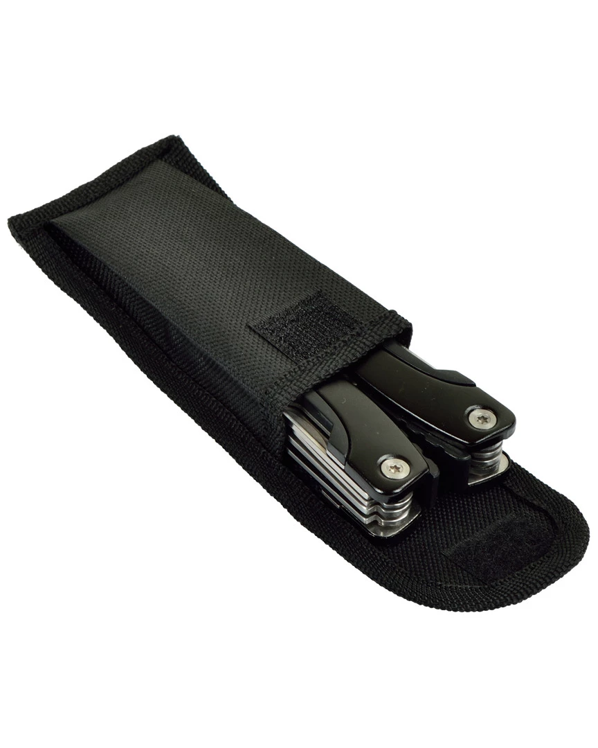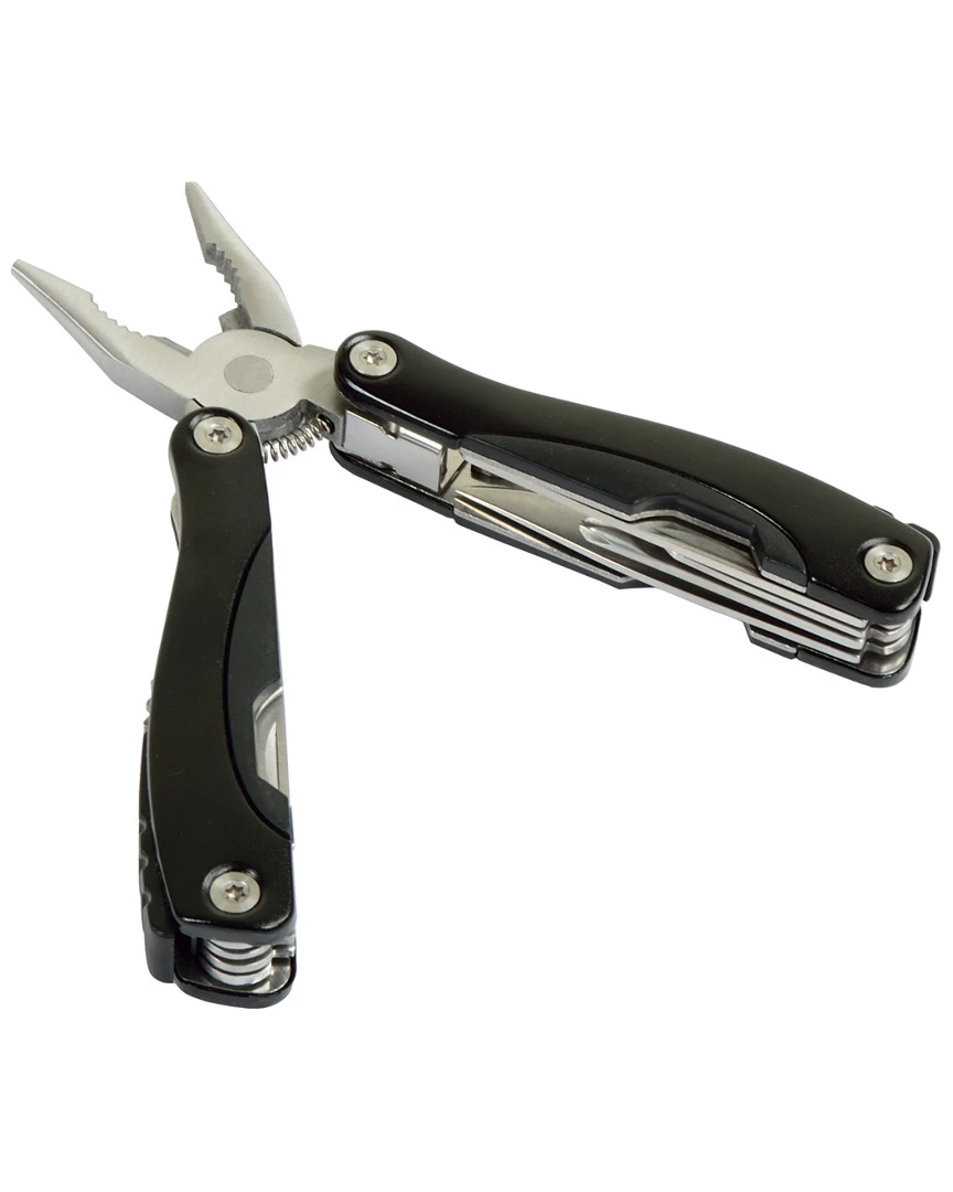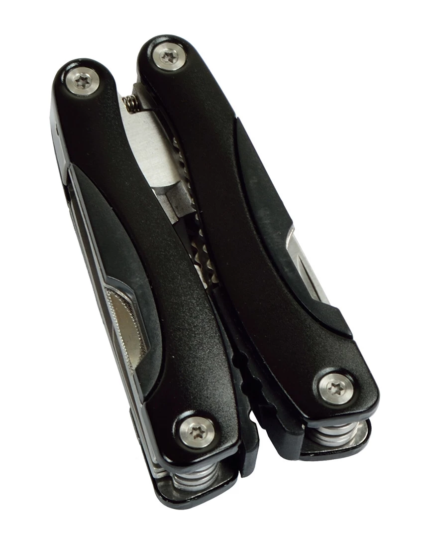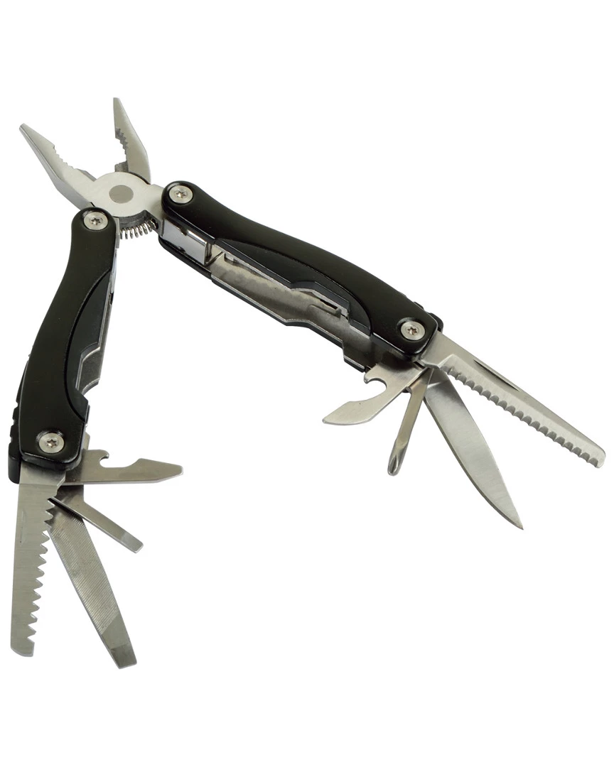 - The tool features a can and bottle opener, Philips head screwdriver, blade, file, two serrated blades, pliers and wire cutters