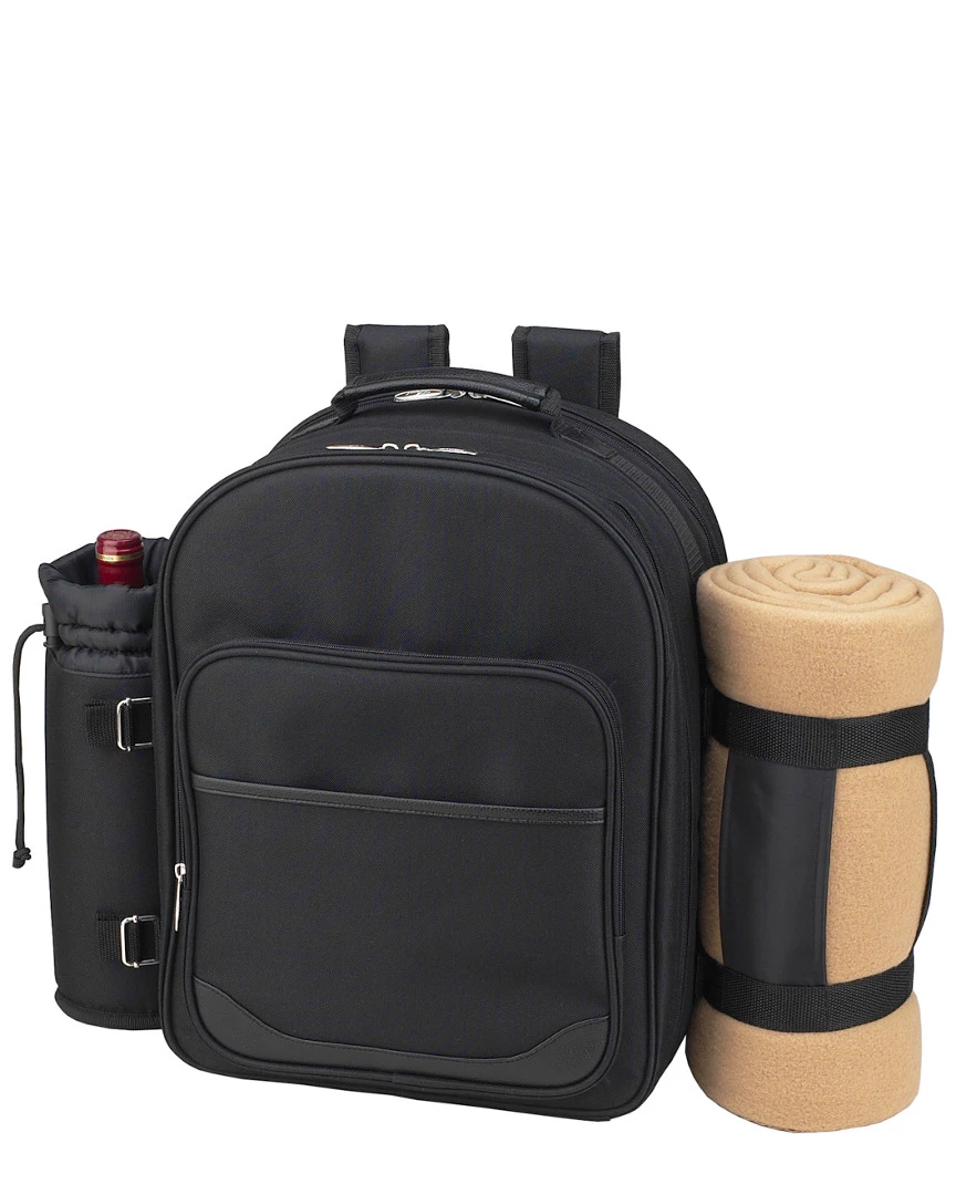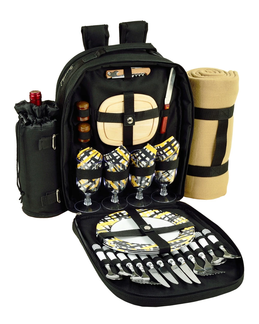 - Design details: Fully equipped polycanvas picnic backpack for four with blanket includes combination corkscrew, hardwood cutting board, cheese knife, wooden salt & pepper shakers with non spill tops, acrylic wine glasses, coordinating 9″” melamine plates, stainless steel flatware, cotton napkins and large fleece blanket with carrier. It also includes a detachable wine holder and Thermal Shield insulated cooler compartment.