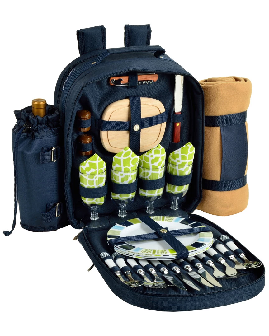 - Our Fully equipped picnic backpack for four with blanket has modern white accents, convenient detachable wine holder, and Thermal Shield insulated cooler compartment to keep food and drink at the perfect temperature. Includes 50″ x 60″ acrylic blanket and carrier, combination corkscrew, hardwood cutting board, cheese knife, wood salt & pepper shakers with non spill tops, acrylic wine glasses, 9″ melamine plates, stainless steel flatware, and napkins. This modern picnic basket has a stylish design and is constructed of 600D polycanvas. Designed and Assembled in the USA. Lifetime Warranty.