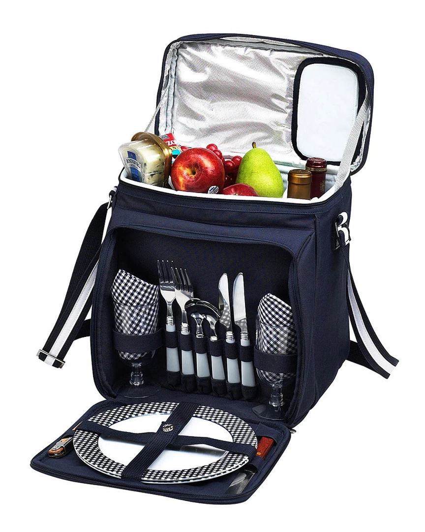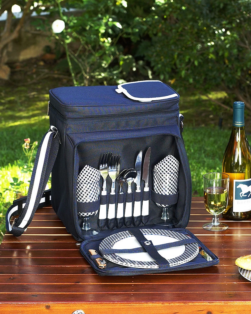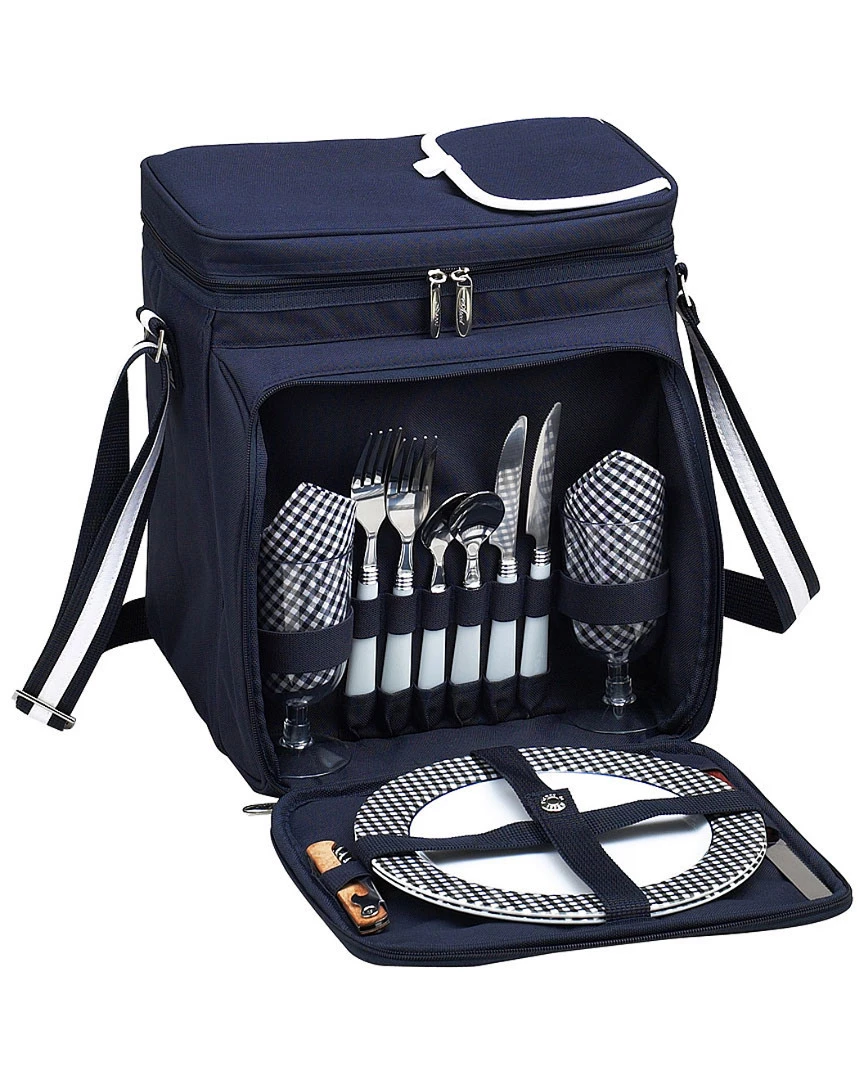 - Fully equipped leak proof navy and white picnic cooler with setting for two, adjustable shoulder strap and Thermal shield” insulated cooler section