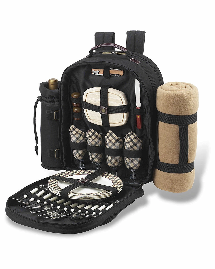 - Classic picnic backpack with setting for four, detachable wine holder, removable blanket and Thermal shield insulated cooler section