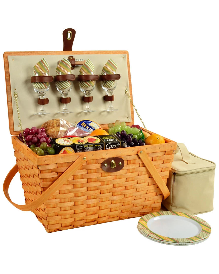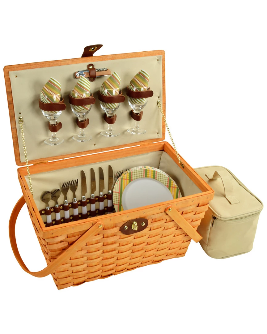 - Design details: fully lined & hand woven with traditional wood slat material, swivel wood handles and faux leather straps and closure. Set includes coordinating melamine plates and cotton napkins, glass wine glasses, stainless steel flatware, a corkscrew and a convenient food cooler.