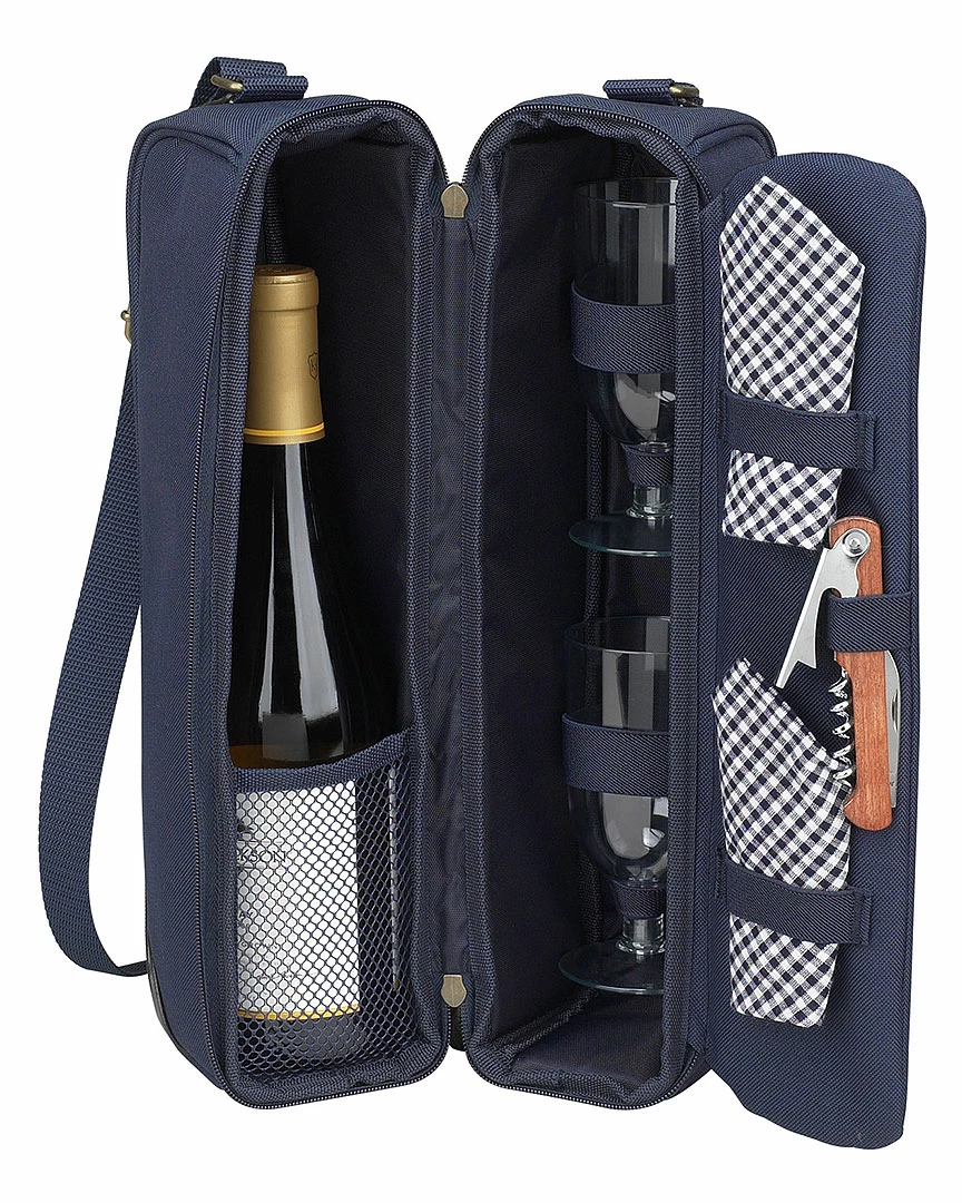 - Navy deluxe wine cooler tote with an adjustable shoulder strap and zippered closure