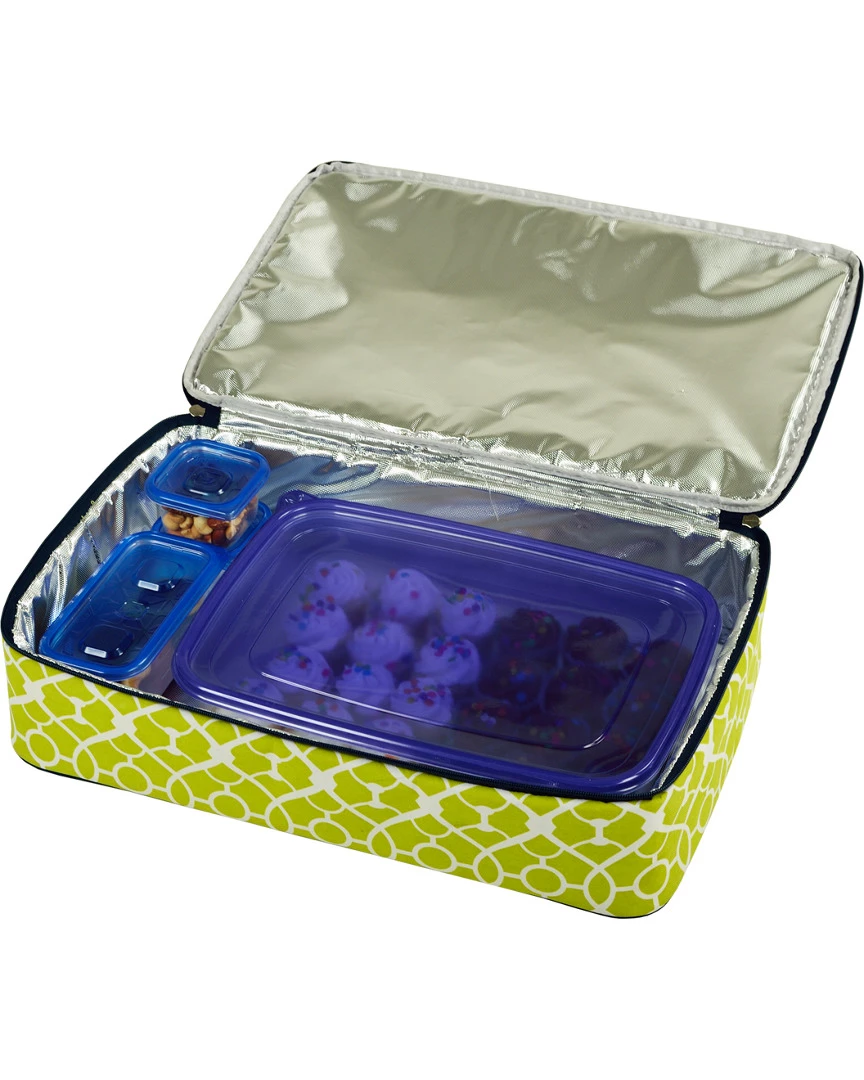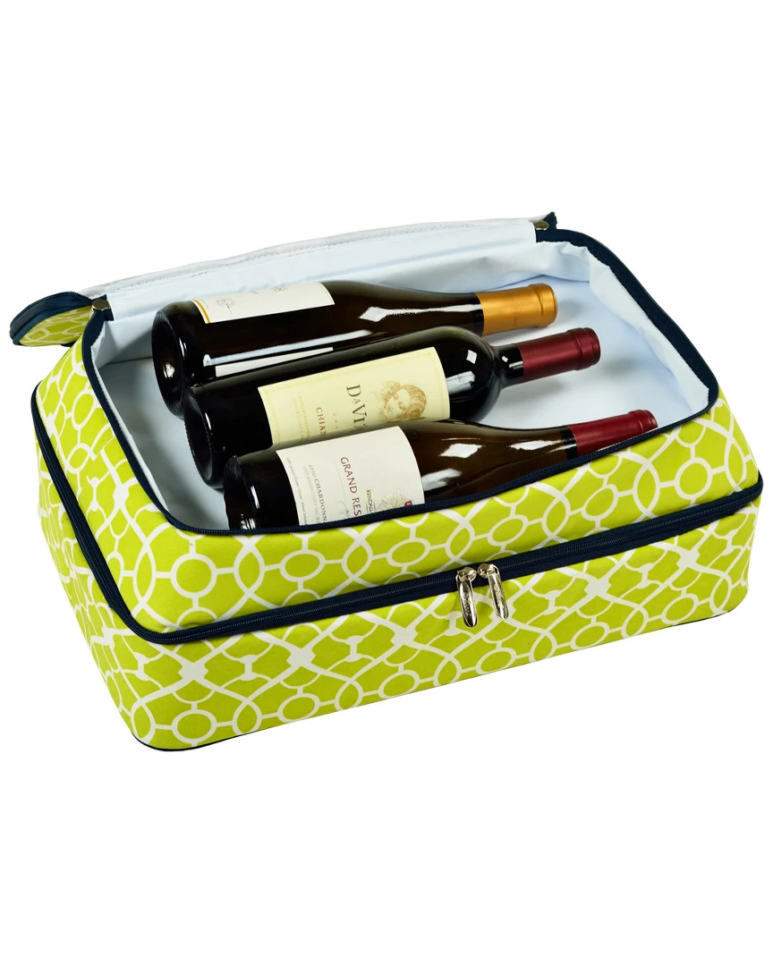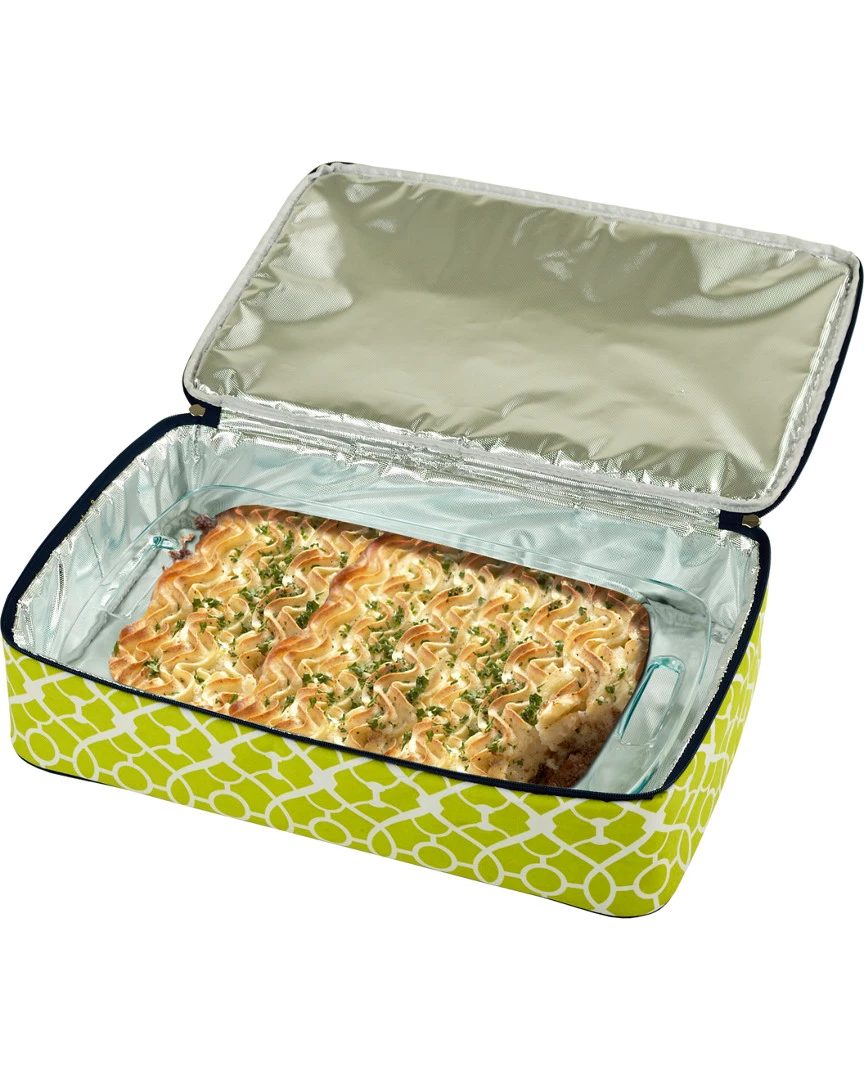 - Two layer food carrier with sturdy construction and Thermal Shield insulation to keep food hot or cold during transport. Has an exterior pocket, perfect for carrying accessories like cutlery, napkins or serving tools. Great to carry casseroles, cakes, rolls, etc. Fits up to a 11″ x 15″ (5 Qt) size casserole dish (not included). The top cooler section fits up to 3 bottles of wine or 9 cans of soda. Features a sturdy centered handle to avoid tipping and zips fully open for easy packing. Durable polycanvas exterior with foil lined bottom section, food safe PEVA lined top section. Lifetime Warranty.