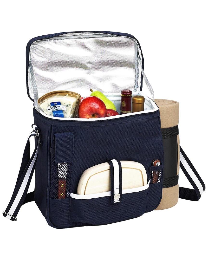 - Design details: This unique wine and cheese cooler with attached blanket is Thermal Shield insulated to keep food and wine at the perfect temperature. It features quality construction and an adjustable shoulder strap to carry. The set includes (1) Corkscrew, (1) Cheese knife, (1) Hardwood cutting board, and (1) Blanket with detachable carrier. The cooler area is divided with three separate sections, 2 for wine bottles, and one larger area for food. The wine bottle divider is secured by hook and loop and can be detached to create one large cooler area if desired. This attractive cooler has a leak-proof lining and adjustable shoulder strap. Designed and Assembled in the USA. Lifetime Warranty.
