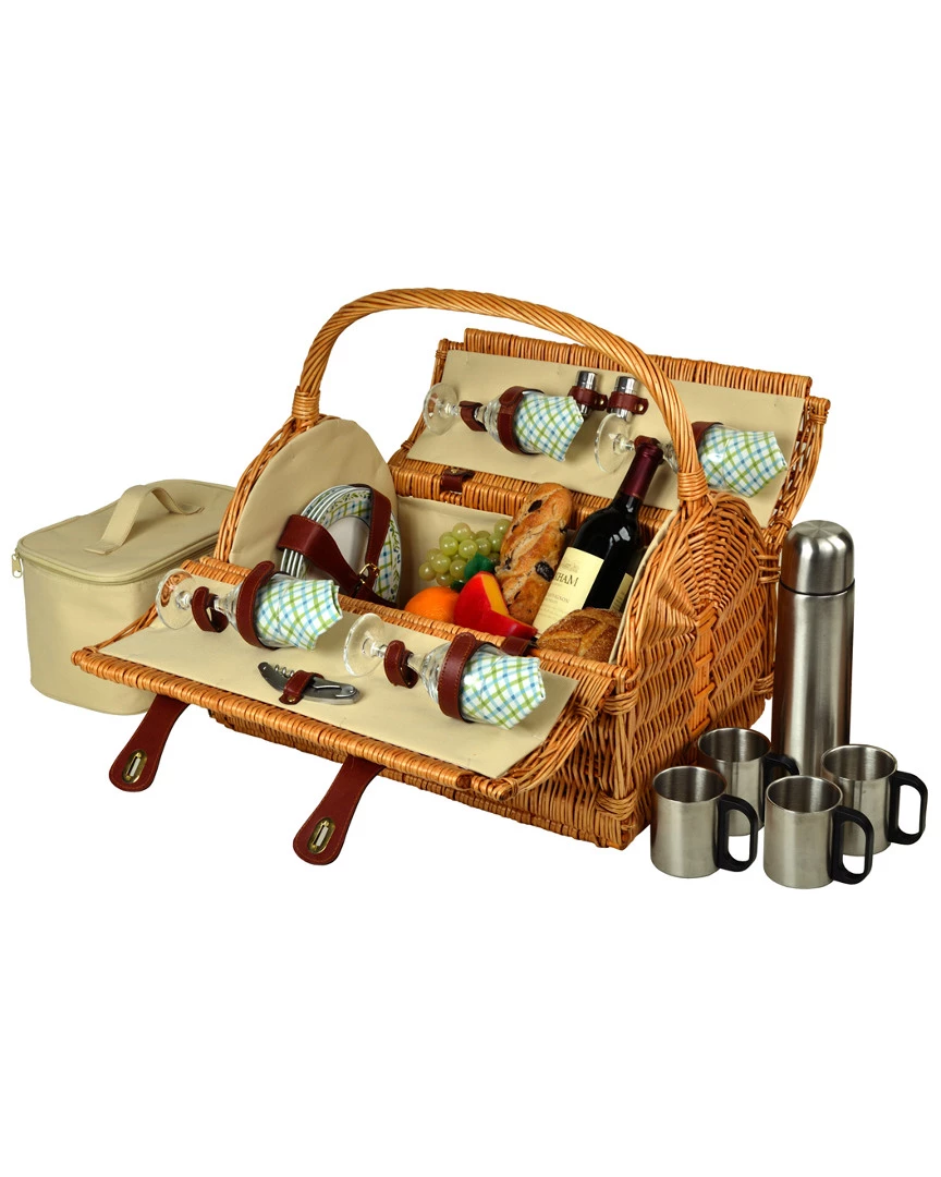 - Traditional picnic basket shape and convenient top carry handle. This set includes coordinating melamine plates and cotton napkins, glass wine glasses, stainless steel flatware, and corkscrew. Also includes a convenient food cooler and coffee set with stainless steel coffee flask and mugs.